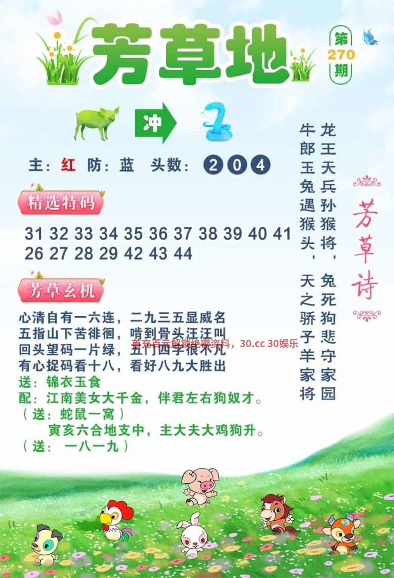 芳草诗:三零四六为正码,二八横空二点四。啸一声心惊胆跳,龙前牛后中间二。