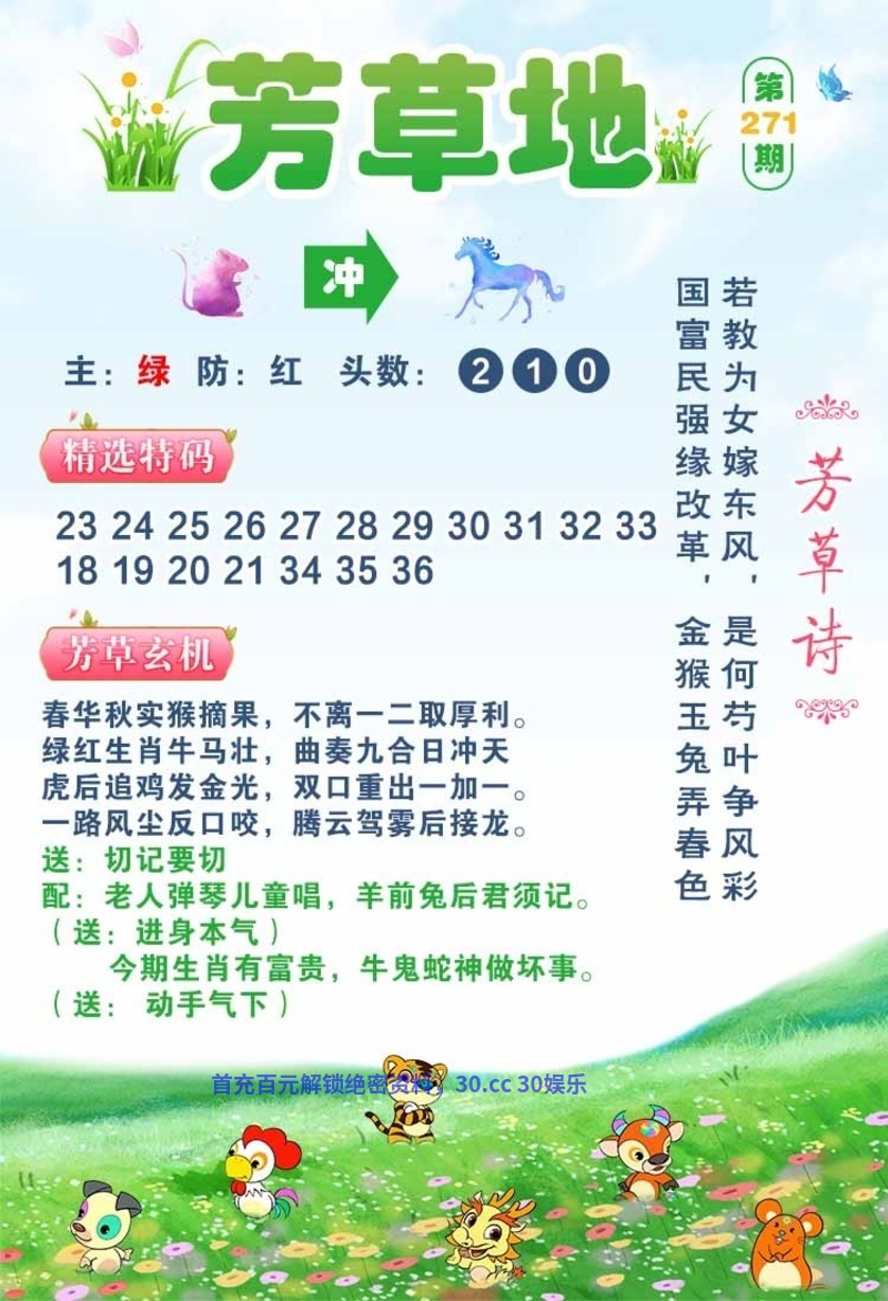 273期芳草玄机三九未全有来生,良言一句三冬暖。二三竿竹见君子,二七还中十码奇。畏长耳朵穿白衣,三春杨柳四五番。四零当选一定红,二顺一来三相求。